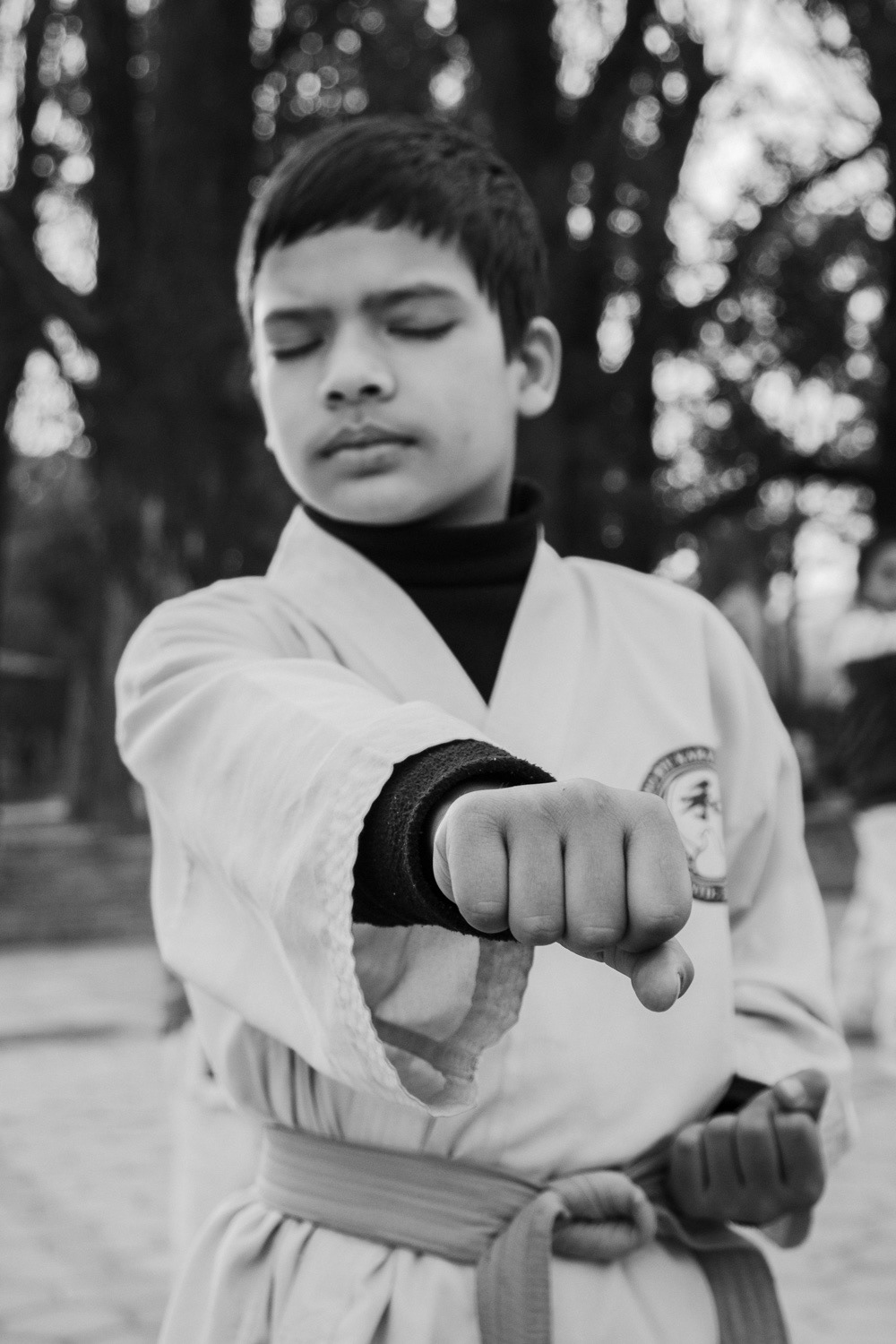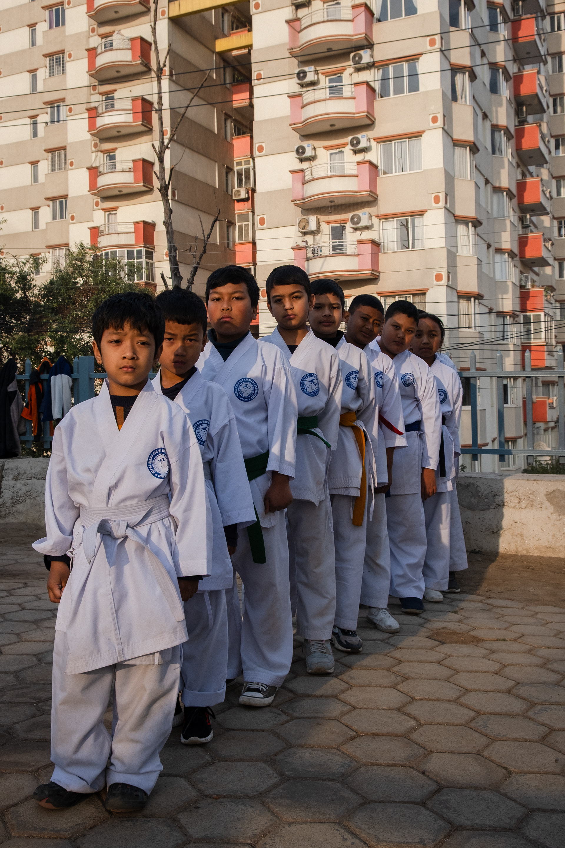 as the sun rise over the park northeast of Kathmandu, it is already filled with early risers. amongst gurkhas in traning and elders doing their tai chi. there is a group of small childen warming up for their wadu ryu karate training. the school children are impatiently waiting for their sensei to come teach their class, as the assistant trainers make them do warm-ups.